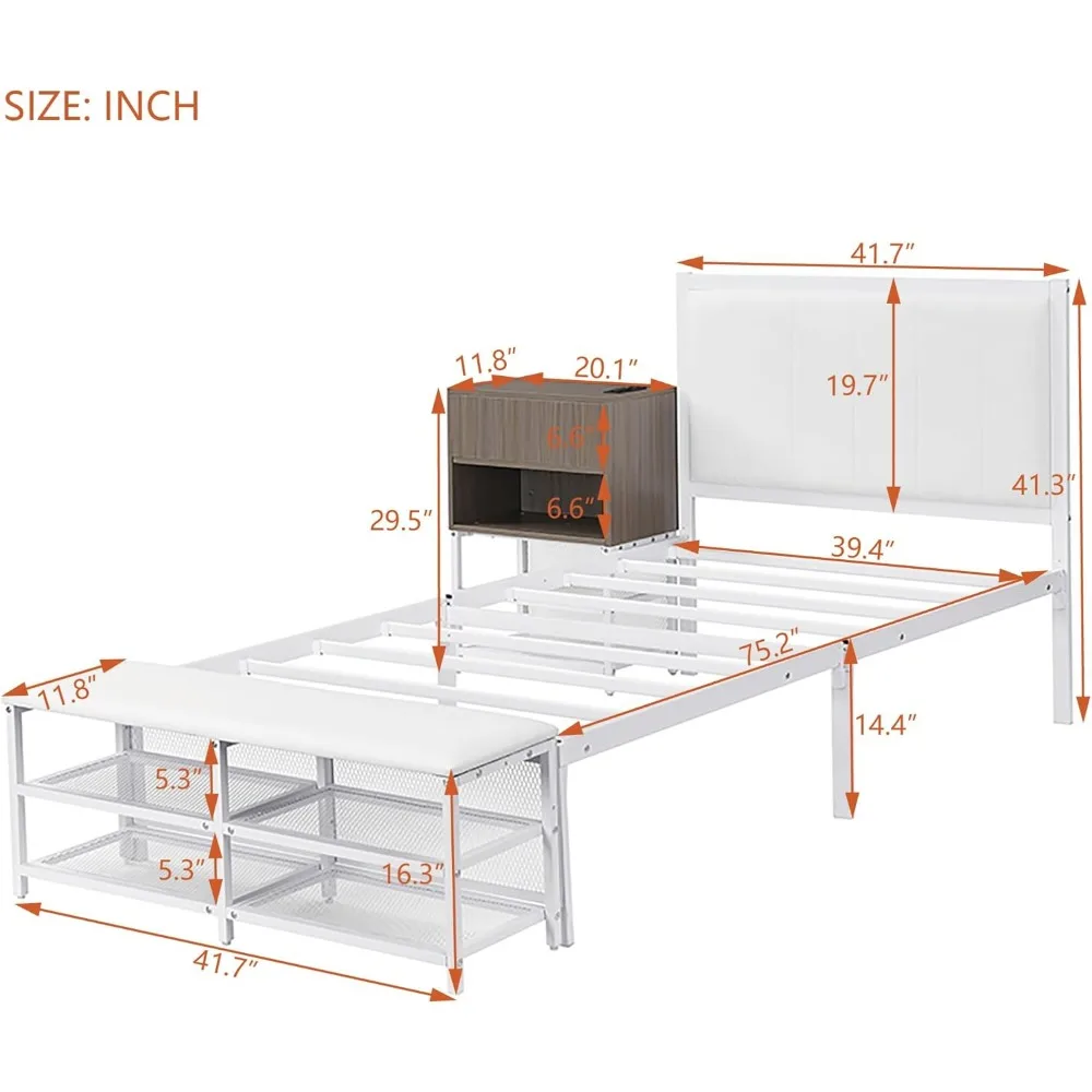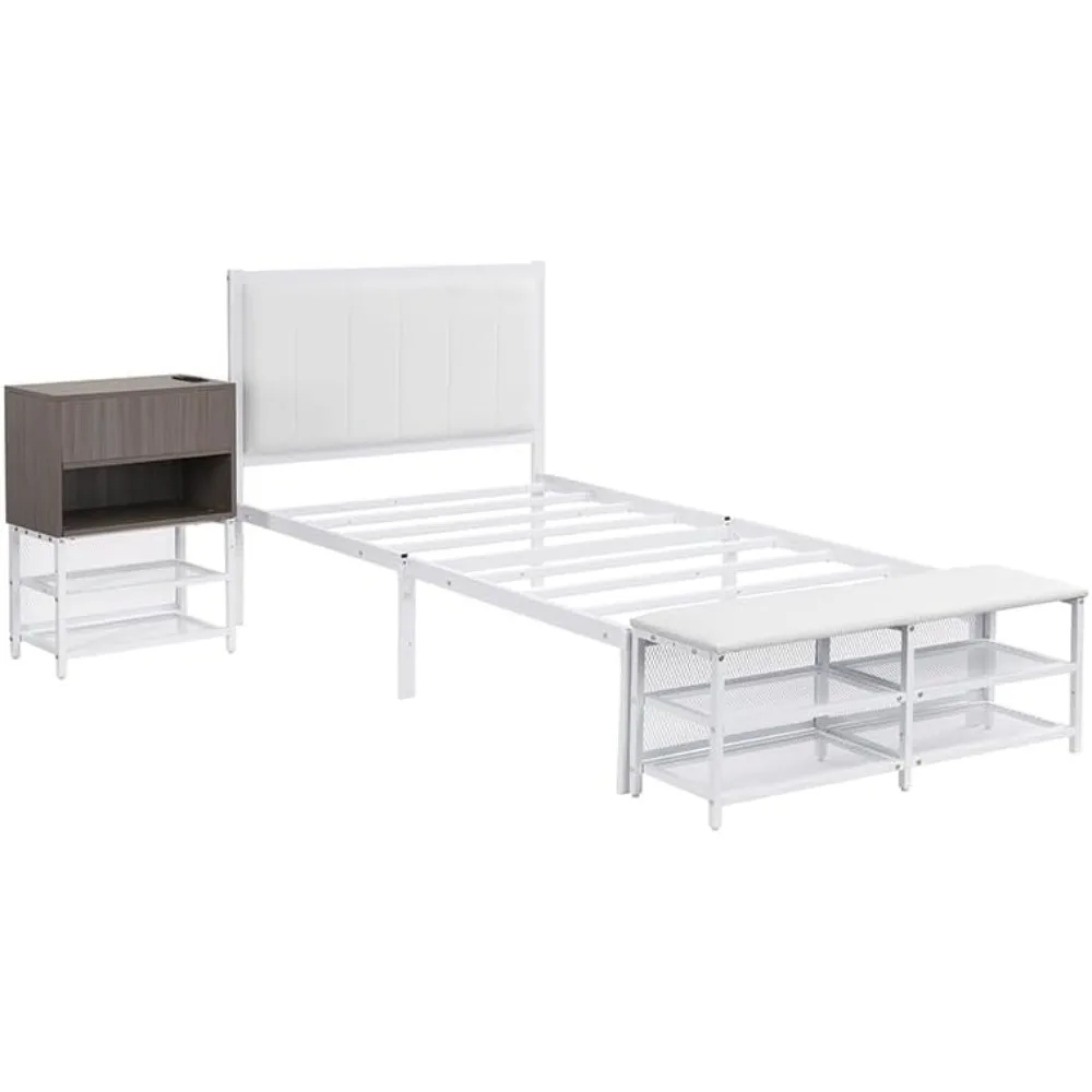 Upgrade your bedroom with this Twin Metal Platform Bed featuring two-tier open storage shelves and a built-in wooden cabinet for added organization. The sturdy metal frame ensures long-lasting durability, while the soft upholstered headboard adds a touch of comfort and style. Perfect for small spaces or modern bedrooms, this multifunctional bed blends industrial charm with practical design, offering both comfort and efficient storage in one sleek piece.